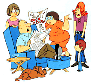 Hanna-Barbera produced this 1972-1974 animated prime time series. Harry Boyle (voiced by Happy Days' Tom Bosley) is a conservative businessman whose elder son, Chet, is a hippie who dropped out of college. His high-school aged daughter, Alice, is a sexually liberated feminist. Only his younger son, Jamie, shows any signs of sharing Harry's values, and his wife, Irma, stays out of the conflict (though she has dreams of finding her own identity and being more than just a wife and mother). Meanwhile, his neighbor Ralph Kane (comedian Jack Burns) masterminds an anticommunist organization so far to the right that they make the John Birchers (and more importantly, Harry) look pinko. Convinced of the imminent arrival of the godless Red hordes, Ralph and his followers have turned one end of the block into an armed camp. Poor Harry finds himself forced to navigate his life safely between all the extremes that surround him.