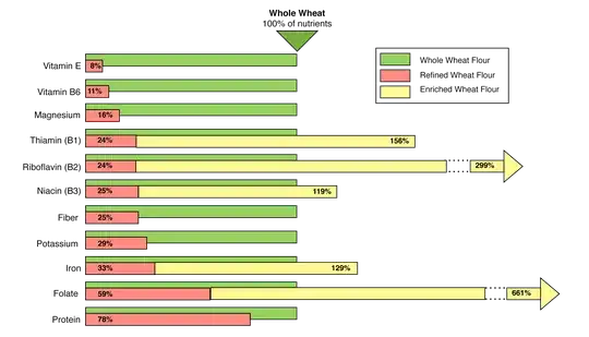 | Flour, unenriched, whole wheat | 5.550 mg, 35% | 3.86 mg, 21% | 0.504 mg, 42% | 0.128 mg, 10% |