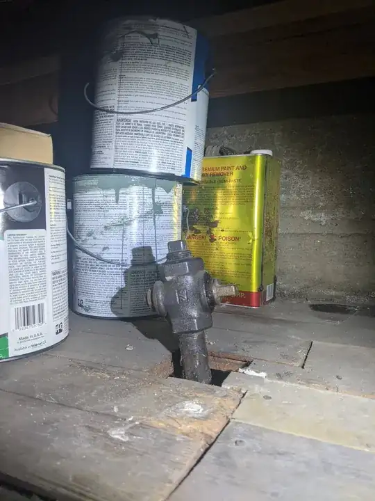 I have a small cupboard in basement I store paint etc. In house has oil heat but getting a sort of gas smell after bumping the pipe feels loose like it was just back filled with gravel . Old home built in 30s I don't have a gas meter electric appliances.