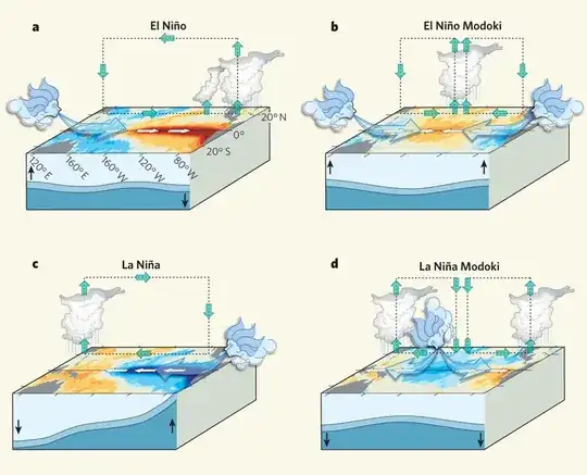 Pertinent to the effects these have are the 'geometries' of the warm SST anomalies that occur with each type. Specifically, type I being described by the authors as being