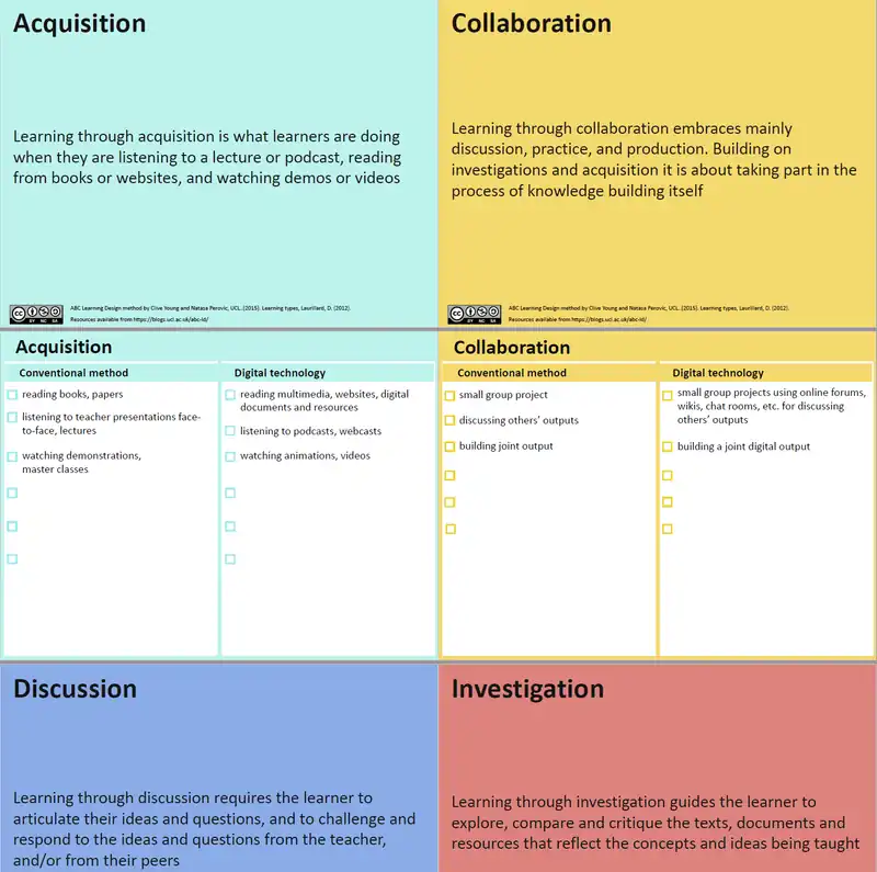 “The ABC curriculum design method (Perovic and Young, 2015) built on the Viewpoints principles and was developed in 2014 as a ninety-minute hands-on rapid-development workshop for UCL module and programme teams. The name itself has significance as it references Arena, UCL’s popular faculty development programme, blended learning and the Connected Curriculum, mentioned above as UCL’s major strategic educational initiative. The Connected Curriculum itself is represented with six dimensions of learning though research and enquiry and is usually articulated as a series of student activities that “close the divide between teaching and research” (Arthur, 2014) and “integrate research into every stage of an undergraduate degree, moving from research-led to research-based teaching”. To align with the Connected Curriculum and its foundation of activity-based learning a new card-set was developed based on Diana Laurillard’s (2012) notion of six ‘learning types’, derived from her theory-based Conversational Framework. The six learning types are acquisition (or read/watch/listen), inquiry, practice, production, discussion and collaboration, and these types form the ABC six-card set.” (Introduction to the ABC LD workshop by Clive Young and Nataša Perović, UCL Digital Education, retrieved feb 2019)