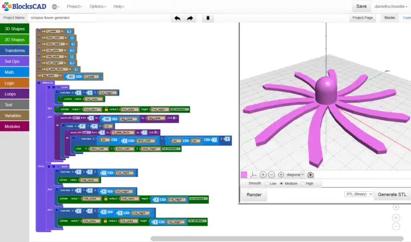 Thanks to the Blockscad community, you have access to a gallery from which you can import projects, modify them and print them. This is an interesting solution to learn how to master more complex features.