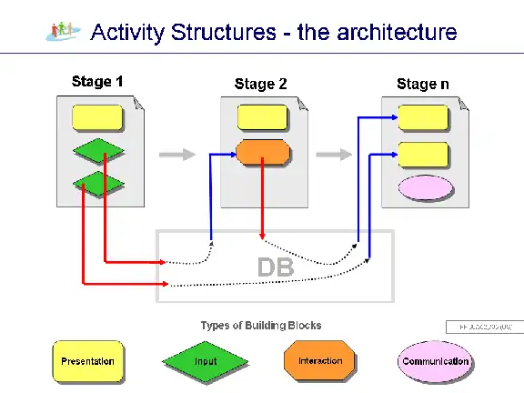 An activity stage can consist of any combination of objects of various types. The functionality is determined by attributing properties related to groups to the stage or to specific objects, so that different participants may encounter different information and perform actions on different data items during the same activity stage. As a result, the process represented by the whole activity is not actually linear, though it may seem linear to each of the participants. A stage may be assigned "start" and "end" times, advance upon completion or according to other conditions defined by the author of the activity.