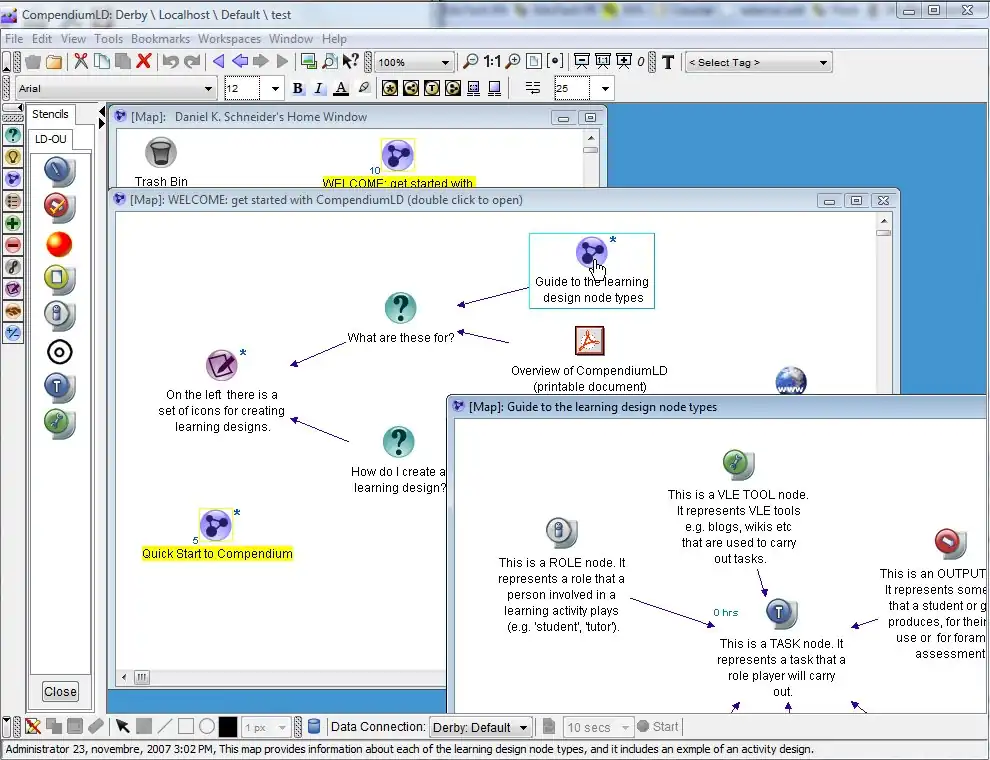 CompendiumLD is a specialised version of Compendium, a mind mapping or argumentation software. All the facilities provided by Compendium are included within CompendiumLD, but a typical Compendium Learning Design user should not use the typical standard nodes.