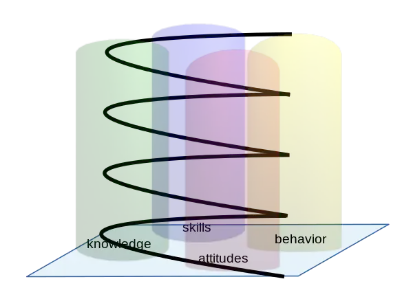 However, Pyramid models do not take into account that development is circular, i.e. takes a form of "spiral". For example, acquiring and changing some attitudes, knowing more "about" e-learning, acquiring a performance level for some skills can bring a learner to a certain level (i.e. be able to follow a self-learning class or a project-oriented blended design). These skill sets are domain restricted. More general e-learning "intelligence" (i.e. being able to understand all sorts of e-learning requirements, and to adapt and engage in successful learning) probably will be developed after experiencing and learning from multiple classes.