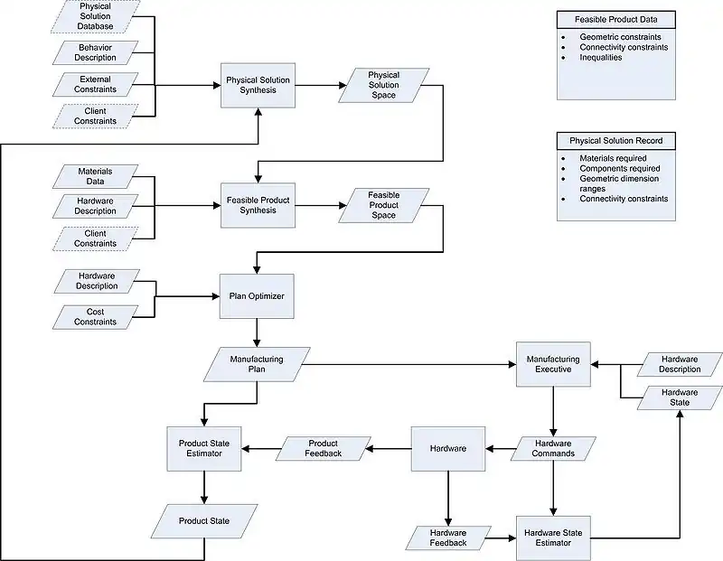 This diagram shows the complexity of software and hardware constraints interaction. Current fabbers can't produce "anything", but near future systems will be able to integrate both solid freeform fabrication (printing 3D objects) and electronic components