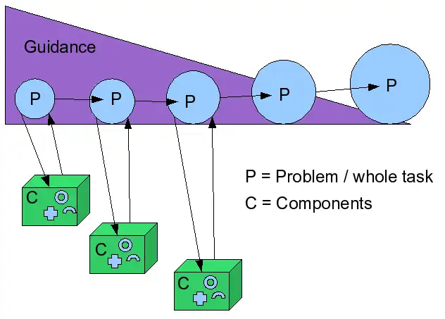 Each increasingly difficult whole task (problem) requires going back and forth from (1) demonstration of the whole task (2) to component "teaching" and (2) back to integration. Once the whole task is mastered, this procedure is repeated which the next whole task until the "real world" problem is mastered without much "direct component teaching".