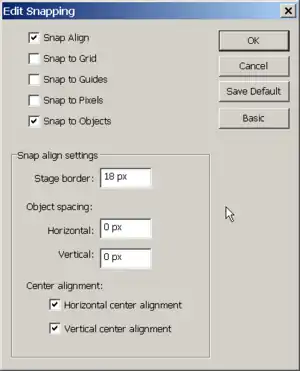 - Note: By default, an object snaps to center of a line ! E.g. if distance is 0px and your lines are 5px wide, your objects will overlap.