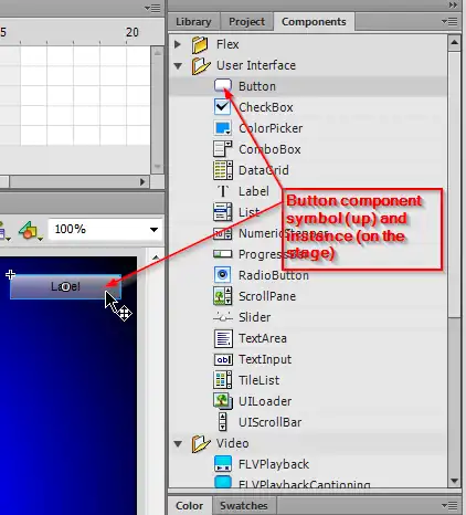 (2) Button components. These are part of the built-in components library that provides various interface components (also called widgets or gadgets) that are easy to use. Technically speaking, these buttons are a kind of embedded movie clip. Graphically speaking, these buttons are some kind of nice looking, semi-transparent rounded rectangles. It is not easy to change their look.