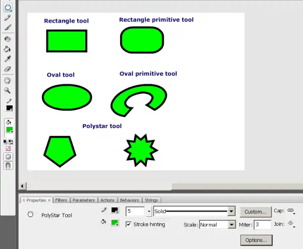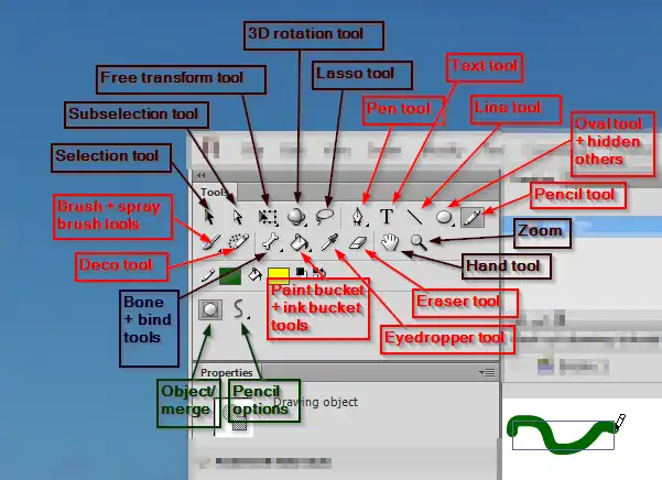 Also see the figure "Items of the Flash CS3 tools panel" above in order to identify the corresponding icons in the tools panel. Some tools are stacked on top of each other. Hold down the mouse button for while to see the hidden ones.