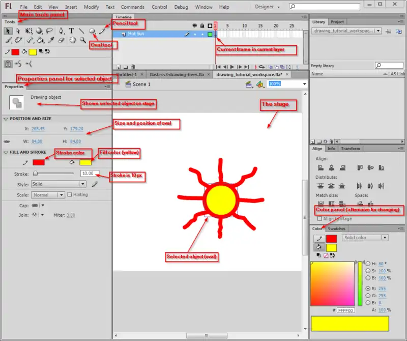 - More about drawing: Flash object transform tutorial and Flash arranging objects tutorial