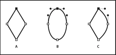 - by dragging the direction points at the end of direction lines that appear at anchor points,
