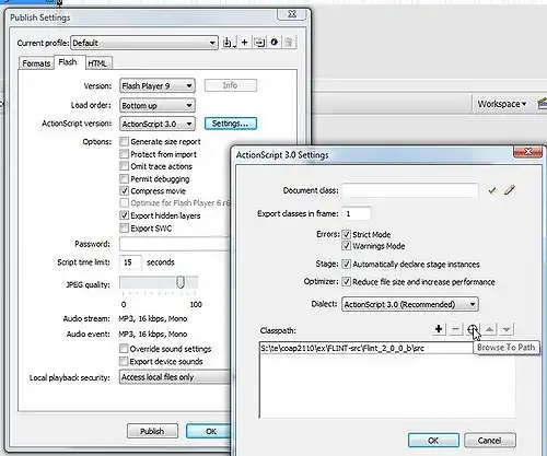 In these ActionScript 3.0 settings, you then have to add the name of the subdirectory where the flint system sits.
