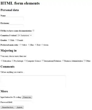 Input elements come in several forms (HTML5 includes additional ones). In this introductory tutorial, we will not introduce the hairy details (there are some), but just provide a few typical examples.