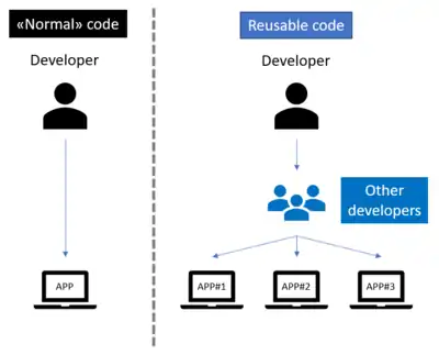 In the case of reusable code writing, the developer wants to create code that other developers can integrate into their applications. Keeping the same example as above, a developer could build a JavaScript drag & drop library (see for example jQuery UI). So he designs code that can be adapted later by another developer, e.g. to drag a product into within a shopping cart of an e-commerce site, etc.