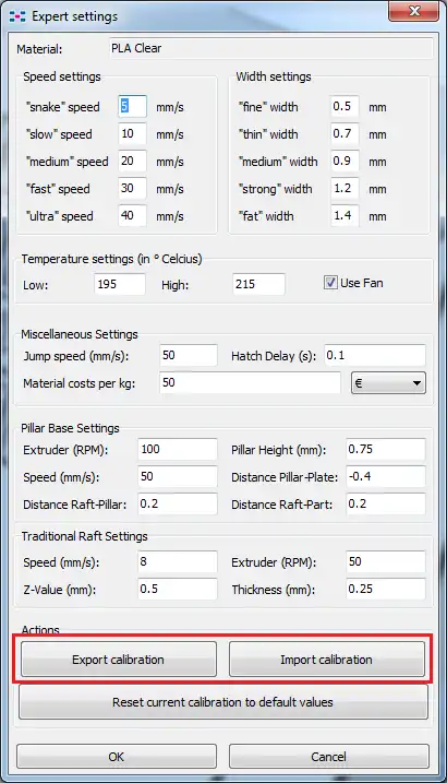 Unlike skeinforge, this software works with a calibration procedure. For each kind (an color) of polymer, you will have to print out 16 calibration squares whose walls you then have to measure with a caliper.