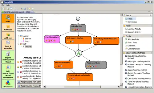 The main goal of developing OpenGLM was to provide comprehensive and intuitive IMS LD modelling software, which reduces the complexity of the IMS LD specification to a degree where teaching practitioners are enabled to build IMS LD conformant units of learning. A subsidiary goal thus was to create translation mechanisms that interpret a graphical representation of a learning design and convert it to the required XML format as specified in the IMS LD information model. These goals were achieved by viewing the activities of learners and instructors as the modelling core around which to build other aspects covered by the IMS LD specification. The activities are graphically displayed and may be freely defined and arranged by the learning designer.