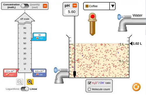 The pH Scale simulation allows mixing typical liquids such as coffee, orange juice, chicken soup, or blood with water and then look at the acidic level. The Macro interface just displays the pH level, i.e. can serve as introduction. The "Micro" tab visualized concentrations (molecules/L) or quantity (molecules)