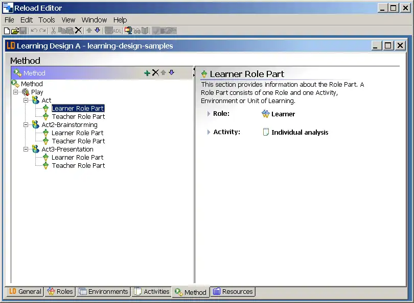 - This specialized Learning Design editor can do more than the 2.5.2 release of the "normal" Reload editor, i.e. it supports all levels of learning design.