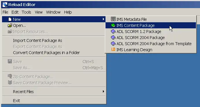 - Select File, New, IMS Content Package. You will be asked to select a new folder to store your package in. Select the resources directory you create above.