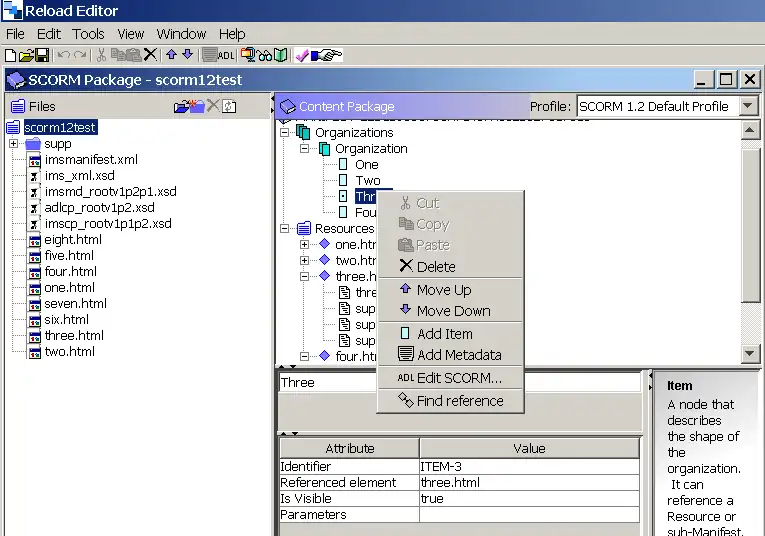 SCO items have a "." in the icon. In the example to the left, this would be item Three. In older Reload Editor versions, one also could see SCORM properties as sub-items. (Daniel K. Schneider doesn't know how to "un-SCO-fy" an item without editing the xmlmanifest.)