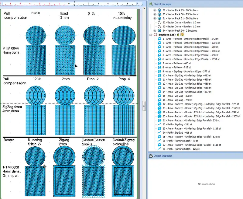 In this section, we will introduce two things: 1) how to deal with "pull", a kind of distortion that is inherent in embroidery. 2) that you should be aware of the object manager and the section inspector. These tools provide an easy way to manage already digitized stitch sections.