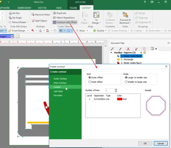 - Add two contour lines (a) one that is 0.5mm off the black border and (b) one that is a bit more inside. To do so, use "Custom", "Inner offset" and set the offset to 0.5mm and the other to 3.5mm.