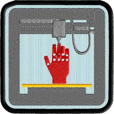 The simulated result looks like this, i.e. the 3D printer is not correctly rendered and the red hand would need some adjustment at the stitch level. The result is usable, but we would like to have something that is slightly better.