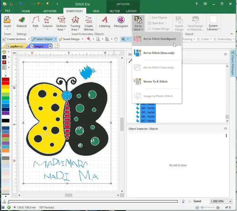 - Have the vectors overlap before digitizing or modify some stitch sections to overlap. In particular the zizag contour of the butterfly to the left should be made to overlap and the green running stitch must be moved closer or maybe be removed. This can be quite tedious. You can enlarge any object (either in both or a single direction) but then you also will to adjust size and position of the other objects. The best solution is to edit the vectors, i.e. move the control points. Before doing so, you really should trim the vectors i.e. make them simpler. Select at least two, then you can "trim shapes" through the combine vectors dialog (in the layout ribbon bar or in the context menu). Read Stitch Era - vector graphics for more information.