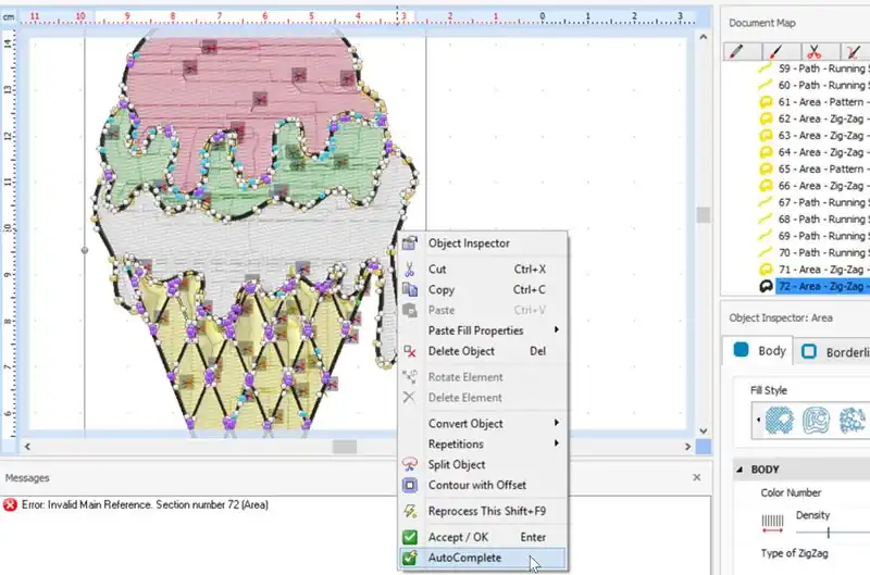 - To try first: Select the stitch section that has problem. In the context menu (right click) that pops out over the workspace (drawing) area, select autocomplete. This will attempt to finish problematic sections, e.g. ones that have main reference or section line problems. If you stitches now a are generated, you are done.