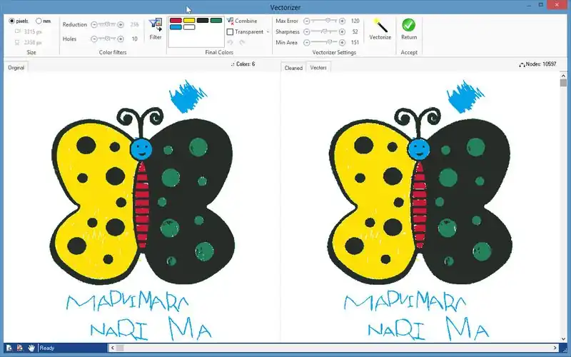 In the same toolset (Artwork->Layout) you can reduce colors. For an embroidery you should use a minimum of colors, maybe between 5 and 10. We strongly suggest to do this even if you believe that you only can see N colors. Various physical constraints from paper and drawing plus the scanning will actually give you lots of colors. E.g. in picture below, there are several shades of green due to different pressure, overlays, etc.