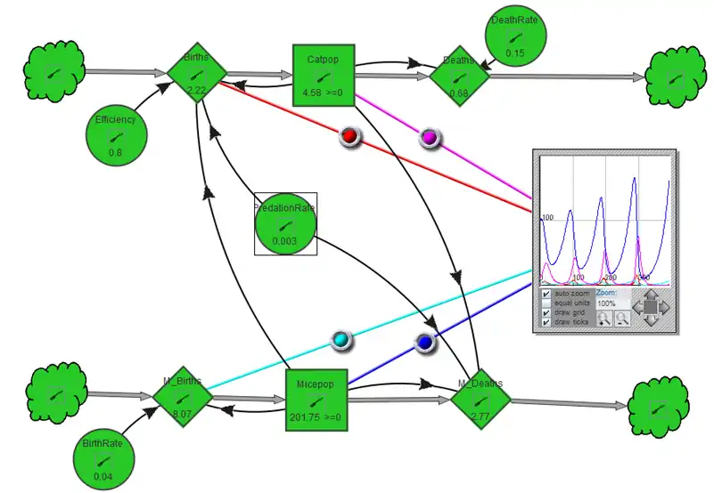 - PredationRate (moderated by an efficiency rate) defines what mice percentage of mice * cats will be killed mice. One cat for 100 mice will kill little, but 10 cats for 100 mice much more.