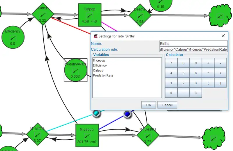 Births = Efficiency * CatPop * MicePop * PredationRate. Mouse Death = CatPop * MicePop * PredationRate.