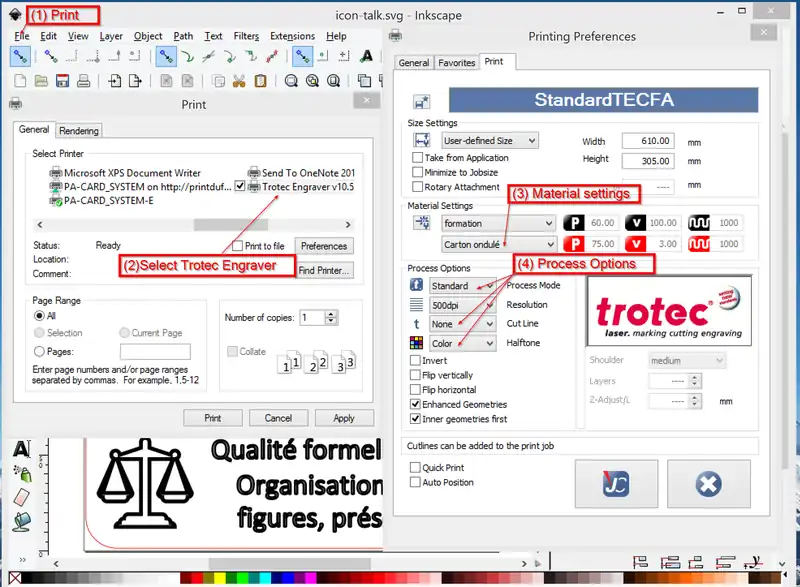 Then click bottom "print" icon and "print" again from the Windows software. Trotec JobControl now will open and the print file should appear in the jobs queue to the right.