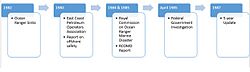 The flowchart above shows the events that occurred directly following the sinking of the ocean ranger. In 1983, the East Coast Petroleum Operators Association published a report on offshore safety which analyzed the current state of affairs. The Royal Commission on the Ocean Ranger Marine Disaster (RCOMD) [1] published parts I and II of their report on the ocean ranger; this report identified the primary causes of the ocean ranger disaster and the primary action items to prevent such an event from being repeated. In 1985 and 1987 respectively a federal government investigation into the Ocean Ranger disaster occurred and a five year update report on regulatory improvements since the Ocean Ranger was published. Parts I and II of the RCOMD report identified three primary groups involved in the Ocean Ranger sinking: government, industry, and researchers.