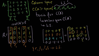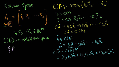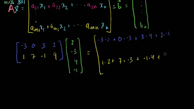 We will define matrix-vector multiplication and think about the set of vectors that satisfy Ax=0 for a given matrix A (this is the null space of A). We then proceed to think about the linear combinations of the columns of a matrix (column space). Both of these ideas help us think the possible solutions to the Matrix-vector equation Ax=b.