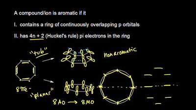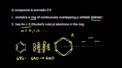 In this tutorial, Sal and Jay explain the concept of aromatic stabilization and show how to determine if a compound or an ion exhibits aromaticity. Knowledge of MO theory is assumed.