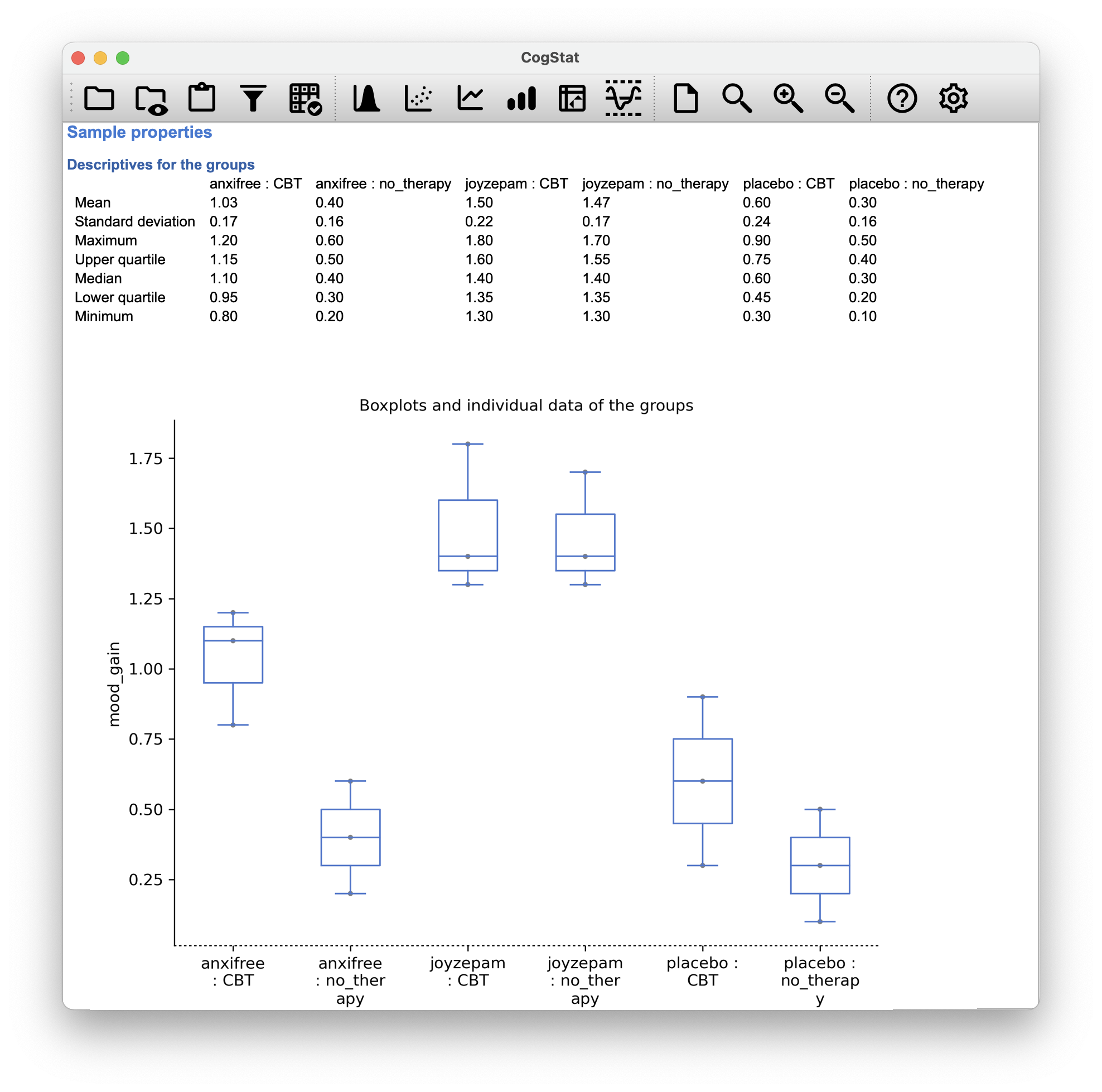 Now, this output by CogStat shows a cross-tabulation of the group means and other descriptive statistics for all possible combinations of the two factors (e.g. people who received the placebo and no therapy, people who received the placebo while getting CBT etc.), and it also shows a boxplot comparing these combinations.