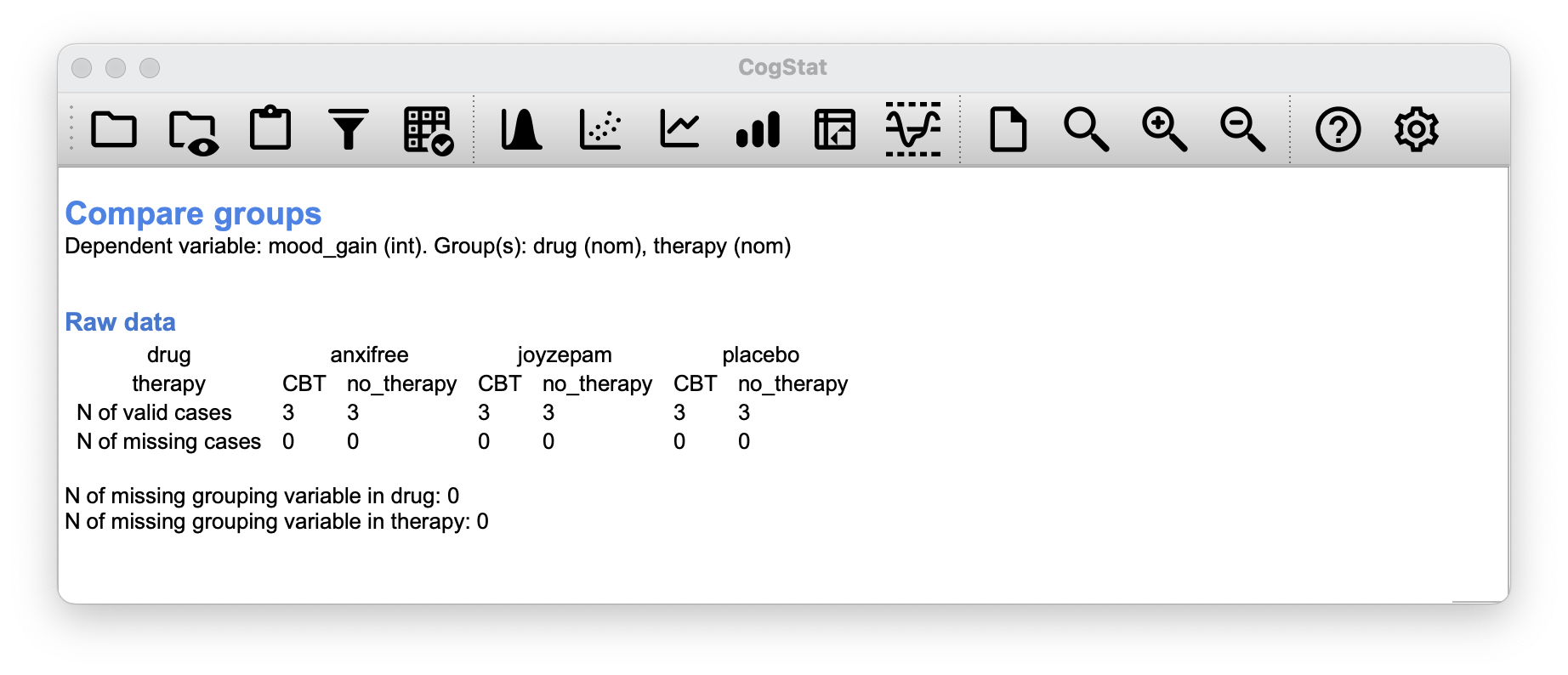 For this analysis, each person is cross-classified by the drug they were given (a factor with 3 levels) and what therapy they received (a factor with 2 levels). We refer to this as a factorial design. Let’s load the clinicaltrial.csv data set again to CogStat, and run the Compare groups function with both drug and therapy as grouping variables.
