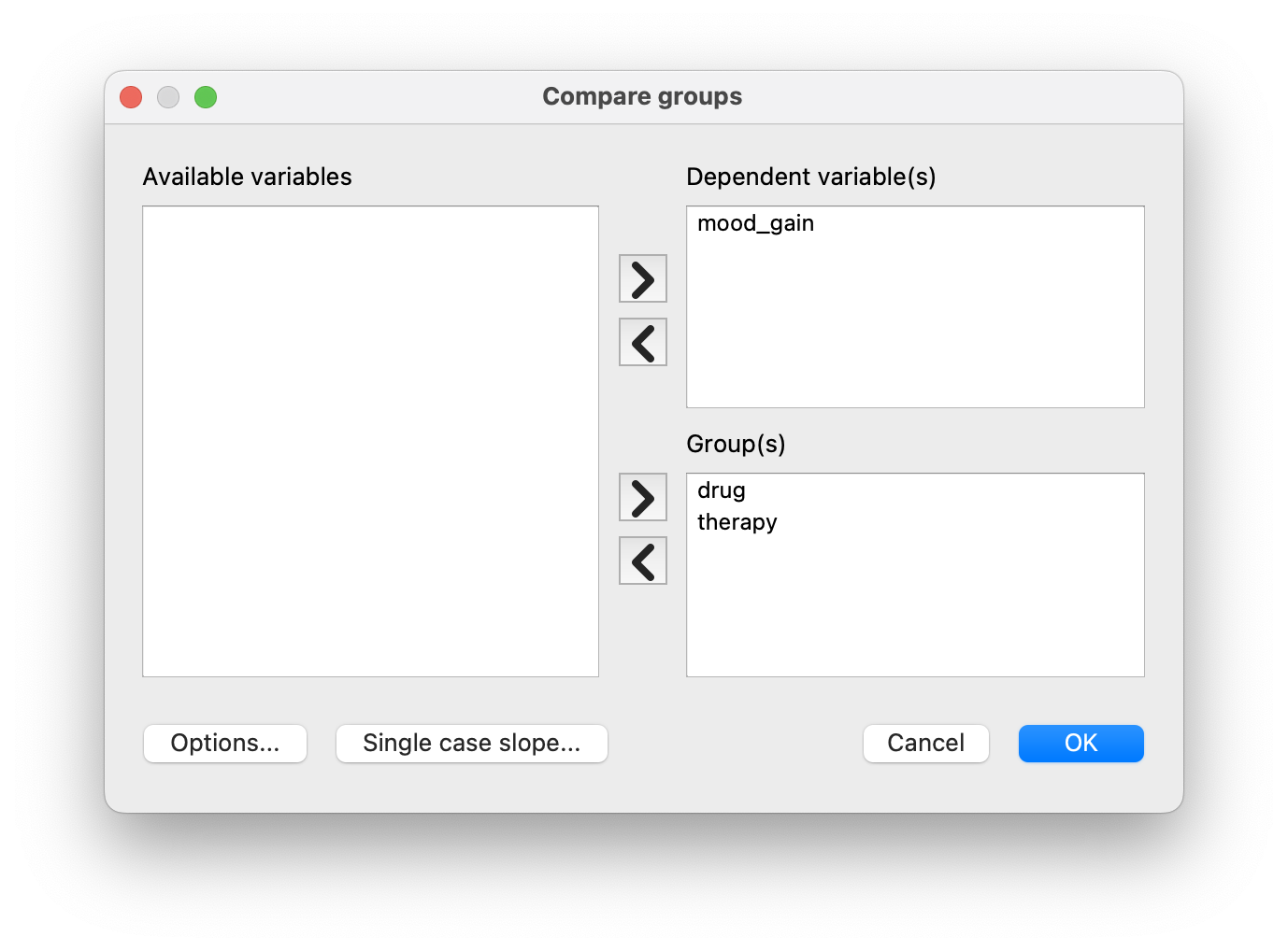 Now that we have this notation, it is straightforward to formulate and express some hypotheses. Let’s suppose that the goal is to find out two things: firstly, does the drug choice have any effect on mood, and secondly, does CBT have any effect on mood? These aren’t the only hypotheses that we could formulate of course, but these are the two simplest hypotheses to test, and so we’ll start there.