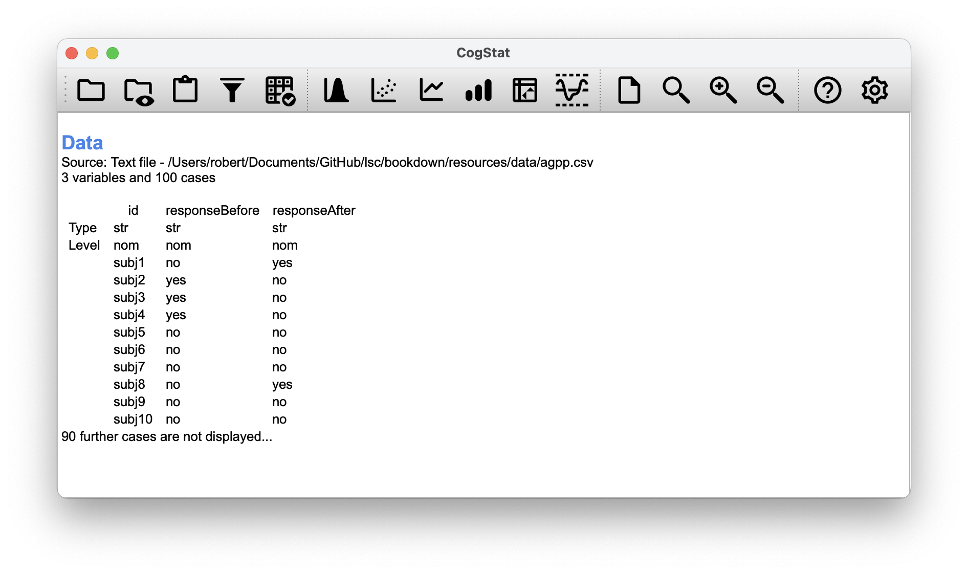 Now that you know what the McNemar test is all about, lets actually run one. The agpp.csv file contains the raw data. It contains three variables, an id variable that labels each participant in the data set, a responseBefore variable that records the person’s answer when they were asked the question the first time, and a responseAfter variable that shows the answer that they gave when asked the same question a second time.