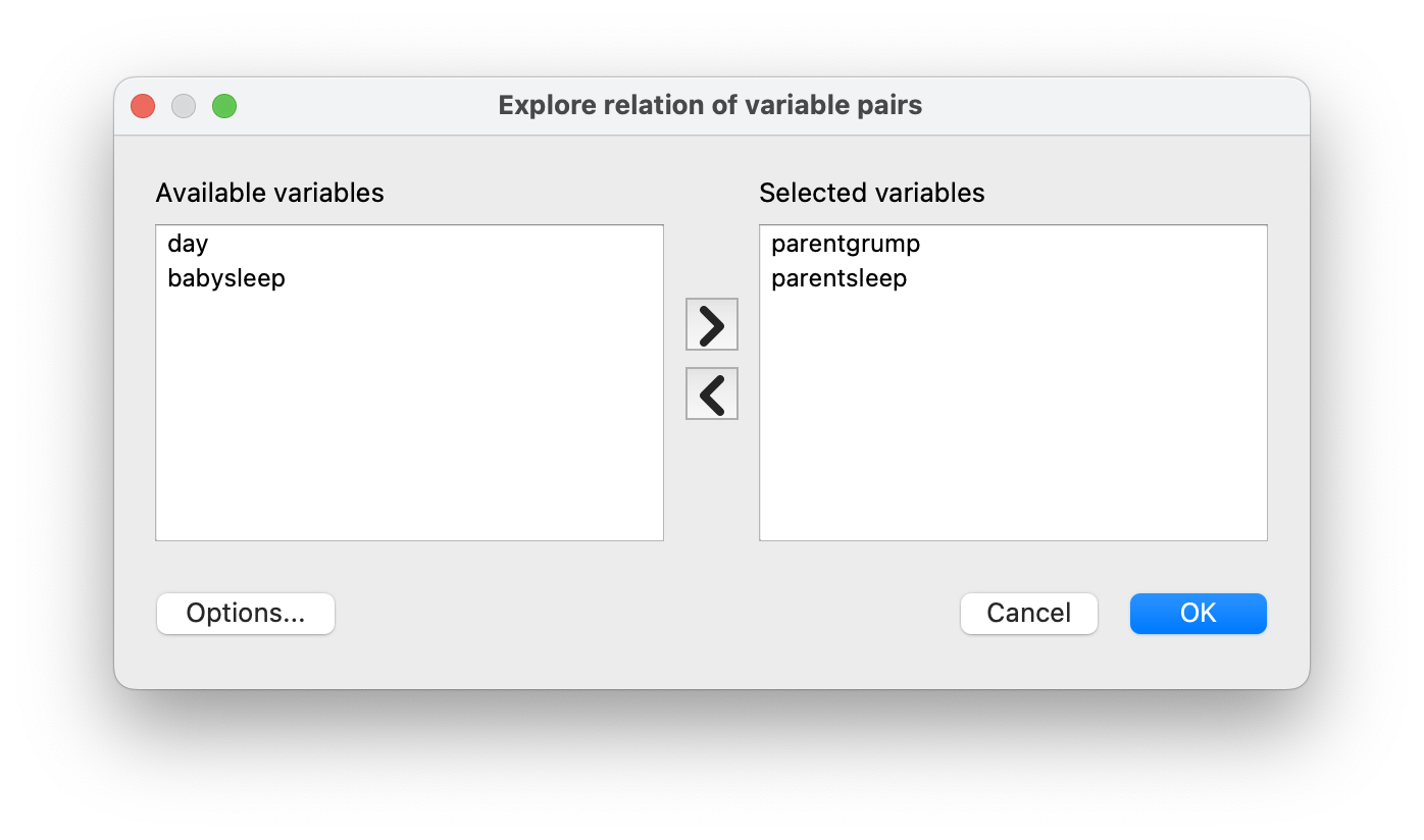 Whichever pair you’d like to run (e.g., parentsleep vs. parentgrump), CogStat will automatically exclude the missing values from the calculation:
