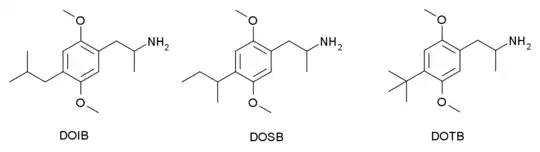 Alternative isomers of DOBU can also be produced, where the 4-(n-butyl) group of DOBU is replaced with any of the three other butyl isomers, the iso-butyl, sec-butyl and tert-butyl compounds being called DOIB, DOSB and DOTB respectively. All are significantly less potent than DOBU, with DOIB being active at around 10–15 mg, and DOSB at 25–30 mg, and both being primarily stimulant in action with little or no psychedelic effects. The most highly branched isomer DOTB was completely inactive in both animal and human trials.