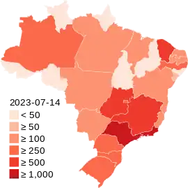 The 2022–2023 mpox outbreak in Brazil is a part of the ongoing outbreak of human mpox caused by the West African clade of the monkeypox virus. The outbreak was first reported in Brazil on 9 June 2022 when a man in São Paulo was registered as the country's index case.[1]
