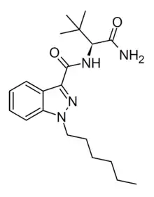 - ↑ Gilbert N, Costello A, Ellison JR, Khan U, Knight M, Linnell MJ, et al. (December 2021). "Synthesis, characterisation, detection and quantification of a novel hexyl-substituted synthetic cannabinoid receptor agonist: (S)-N-(1-amino-3,3-dimethyl-1-oxobutan-2-yl)-1-hexyl-1H-indazole-3-carboxamide (ADB-HINACA)" (PDF). Forensic Chemistry. 26: 100354. doi:10.1016/j.forc.2021.100354.
