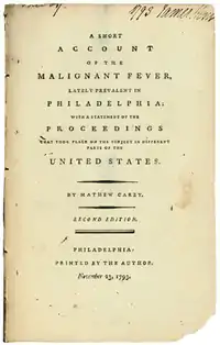 - ↑ Mathew Carey, A Short Account of the Malignant Fever which Prevailed in Philadelphia, 1793, William Reese Company, commercial site, photo of pamphlet cover