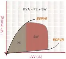 Pressure-volume (PV) loop analysis provides a framework for understanding how acute cardiac unloading reduces MVO2 in the heart.[4][5] The PV loop characterizes the events occurring during a single cardiac cycle (a single heartbeat). The total area bound by the PV loop is the mechanical energy (pressure-volume work) used to actively pump blood every beat, measured in mmHg·mL (aka, a joule ). This is known as the stroke work (SW). The remaining area bound by the ESPVR and EDPVR that is outside of the loop is the potential energy (PE) that resides in the myofilaments that was not transduced into the work of pumping blood. The sum of these two areas (PE + SW) is known as the pressure-volume area (PVA). PVA is a first order approximation of MVO2.[3]