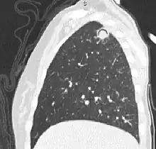 In radiology, the air crescent sign is a finding on chest radiograph and computed tomography that is crescenteric and radiolucent, due to a lung cavity that is filled with air and has a round radiopaque mass.[1] Classically, it is due to an aspergilloma, a form of aspergillosis, that occurs when the fungus Aspergillus grows in a cavity in the lung.[2] It is also referred as Monad sign.[3]