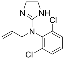 Alinidine (ST567) is a negative chronotrope that was developed in the 1970s and 1980s. It causes bradycardia by inhibiting the pacemaker current by altering the maximal channel conductance and alter the voltage threshold.[1] The development of alinidine was halted because it was not sufficiently specific for its target. It also has a blocking effect on calcium channels and potassium channels. It also causes elongation of re-polarisation after an action potential.[2]