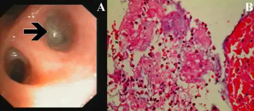 There are hypersensitivity responses, both a type I response (atopic, with formation of immunoglobulin E, or IgE) and a type III hypersensitivity response (with formation of immunoglobulin G, or IgG).[12][18] The reaction of IgE with Aspergillus antigens results in mast cell degranulation with bronchoconstriction and increased capillary permeability.[19] Immune complexes (a type III reaction) and inflammatory cells are deposited within the mucous membranes of the airways, leading to necrosis (tissue death) and eosinophilic infiltration.[12] Type 2 T helper cells appear to play an important role in ABPA due to an increased sensitivity to interleukin (IL) 4 and IL-5. These cytokines up-regulate mast cell degranulation, exacerbating respiratory decline.[20][21][22]